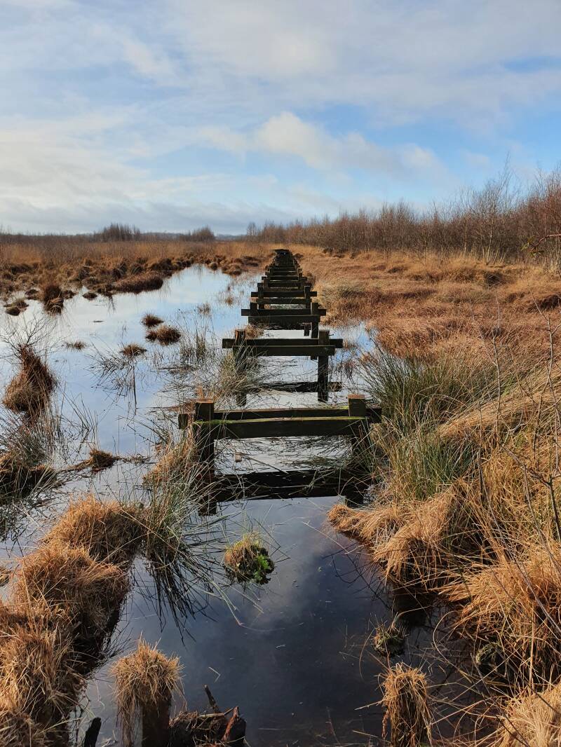 Drassig hoogveen en weidse heidevelden, afgewisseld door bosjes en graslanden. In de verte graast een kudde schapen. Kikkers kwaken in een verscholen poeltje. De rietgors zingt in een rietkraag. Een ontwakende adder warmt op in de ochtendzon. Overal groeit zonnedauw, veenmos en wollegras. Libellen en muggen trekken boomvalken aan.